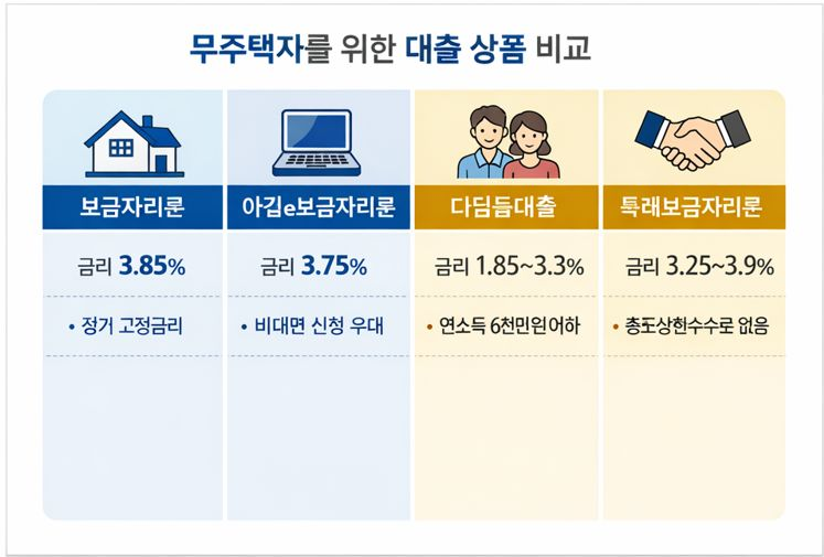 | 디딤돌대출 | 1.85~3.3% | 연소득 6천 이하, 생애최초 주택 구입자 |