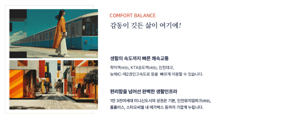 - 다양한 커뮤니티 시설: 피트니스센터, 사우나, 어린이집, 실내놀이터, 실내골프장, 오브제카페 등